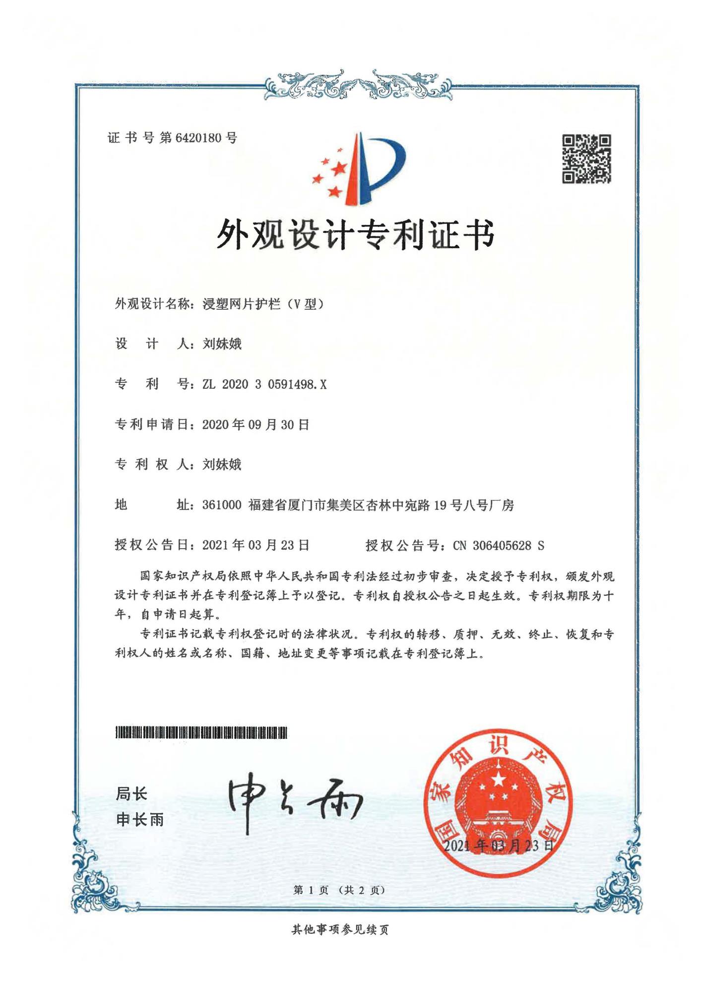 專利證書-浸塑網(wǎng)片護(hù)欄V型