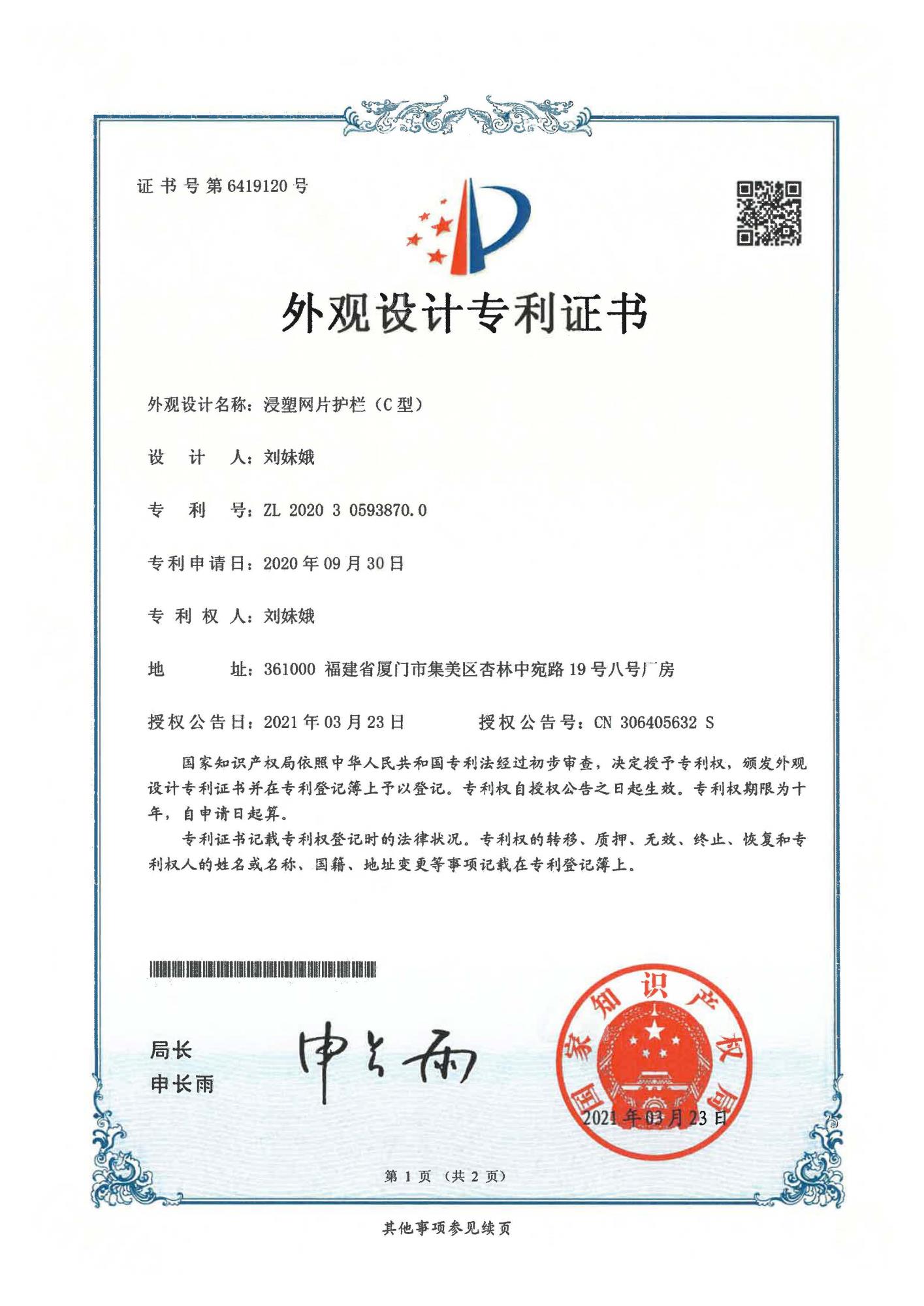專利證書-浸塑網(wǎng)片護(hù)欄C型