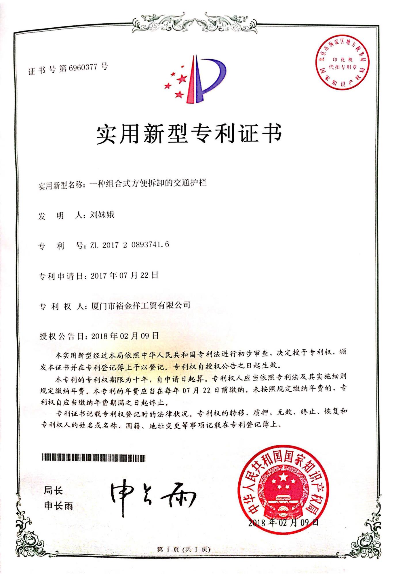 專利證書-組合式交通護(hù)欄