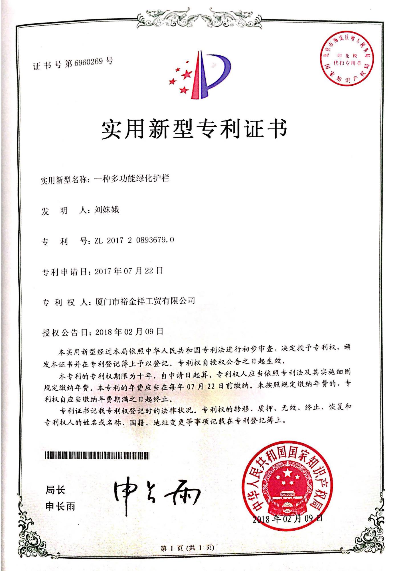 專利證書-多功能綠化護(hù)欄